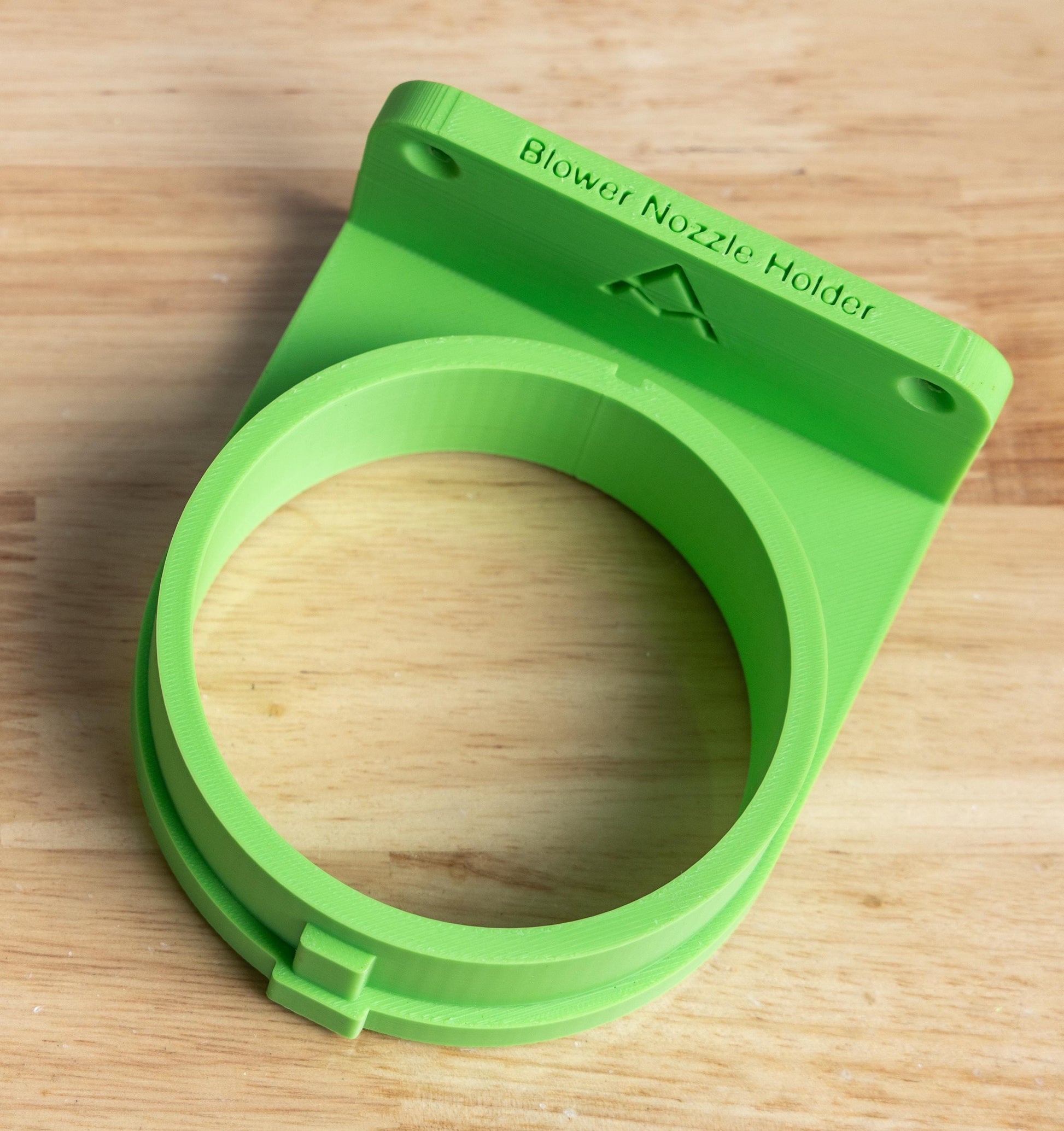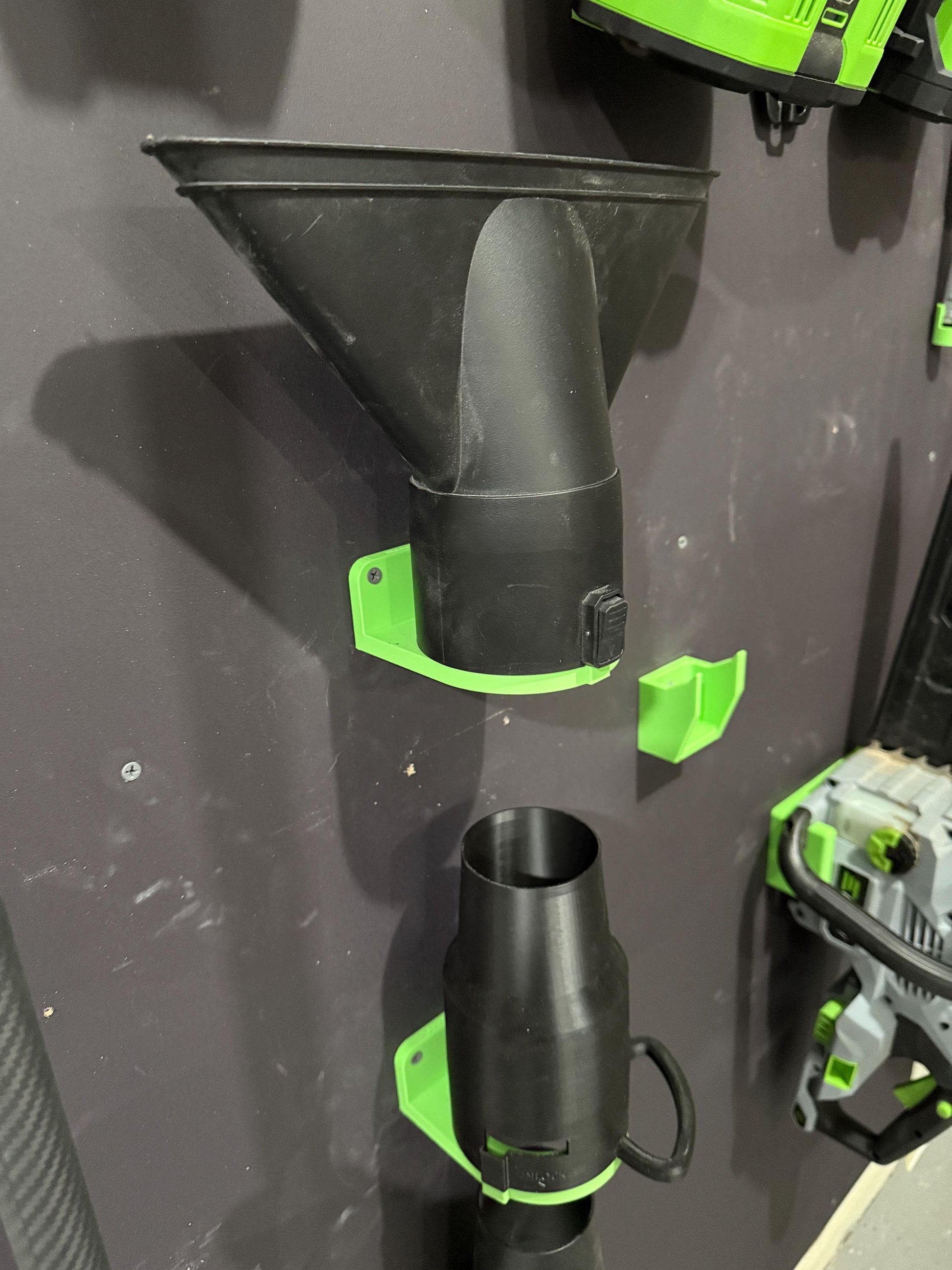 Holds my EGO 675 CFM blower nozzle and stubby nozzle. High quality. The nozzles stay in place once in the holder. Highly recommend!