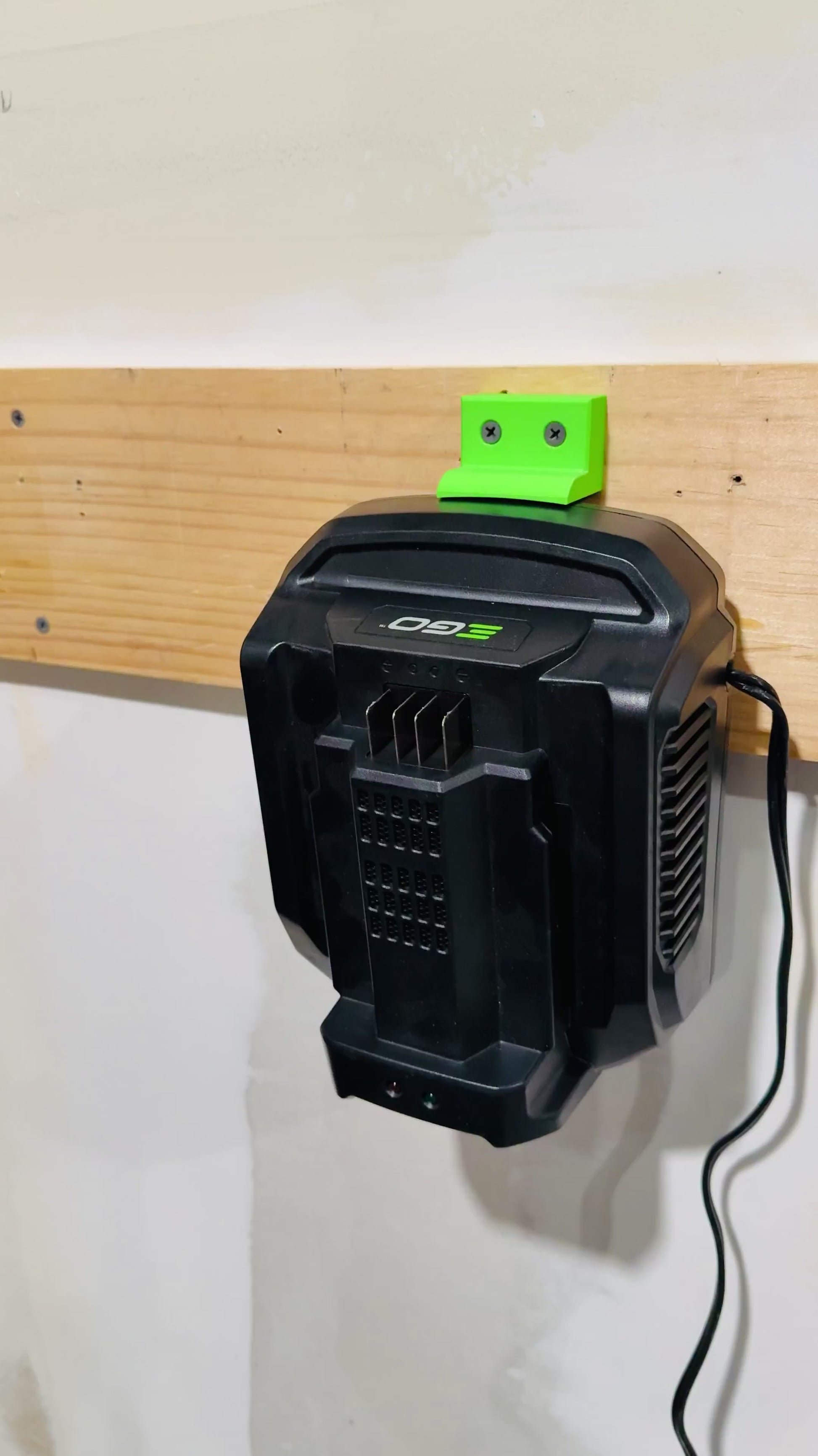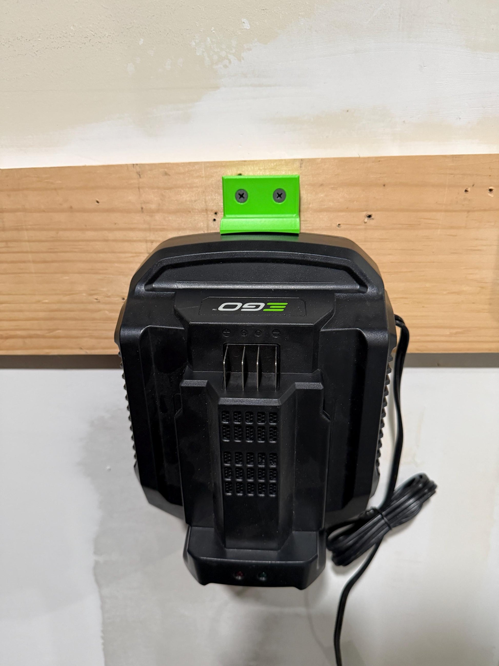Mounting your EGO Battery Charger has never been easier. The wall plate is designed with holes 3 and 4 in on center. No need for a tape measure, just level and screw in leaving some of the screw head exposed for the battery mount to lock into. Top piece is designed to keep the charger in place when lifting a battery off the charger.